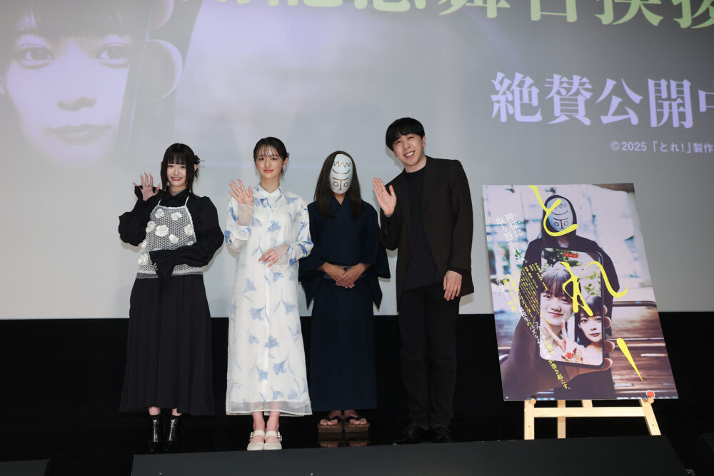 あらためて長編映画監督デビュー作となった本作が初日を迎えた思いを尋ねられたコウイチ監督は「撮影してから1年半以上はたっているので、それまで誰も不祥事もなく無事に公開までたどり着けて、本当に安心しております」とコメントし、ドッと沸いた会場内。一方、本作が映画単独初主演作となる中島も「撮影当時は本当にみんな必死でやっていたんですけど、いざこうして皆さまに見てもらえることになって。ようやく実感が湧いてきましたし、正直にうれしいなと思います」と笑顔。さらにまいきちも「私はお芝居のお仕事の2作品目が「とれ!」だったので。それが公開されるんだと思ったらドキドキで、昨日は眠れなかったです」と語るも、初日を迎えたことに感激した様子だった。