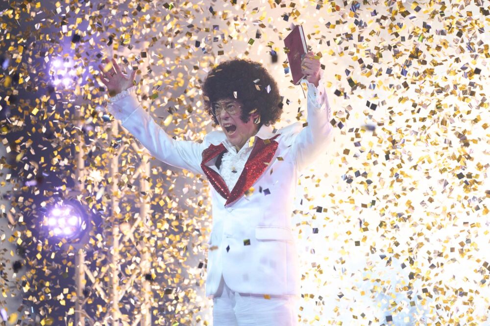 華やかな番組セットにて満面の笑顔で進行を務める司会者・樺山(唐沢寿明)がアシスタントのモンテレオーネ怜華(トリンドル玲奈)と踊る姿だけでなく、解答者の一子(芦田愛菜)をにらみつける姿や銃を構える姿も捉えられ、樺山が二面性のある怪しさ満点のキャラクターであることがうかがえる。