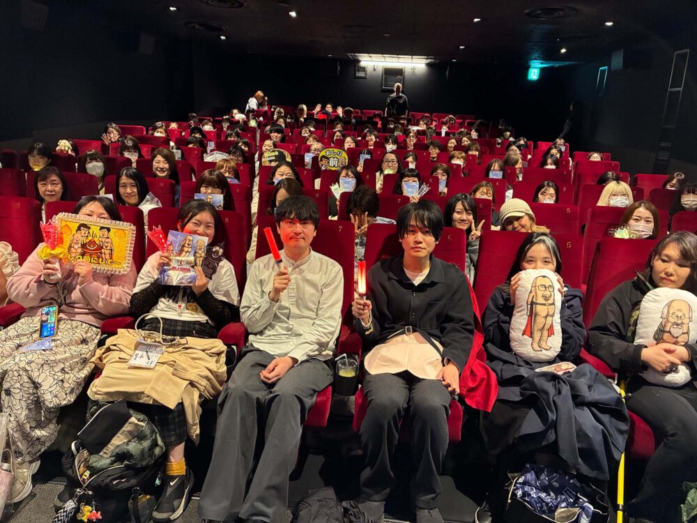 本⽇本作の⼤ヒットを記念して、初の応援上映が⾏われた。上映中には、おしり前マンカラーの⾚⾊や、おしり前レジェンドカラーの緑・⻩⾊のペンライトを⼿にした観客たちが客席を彩り、劇中のバトルシーンでは「がんばれー!」と声援が⾶び交うなど、通常上映とは⼀味違う熱気に包まれ、⼤いに盛り上がりを⾒せた。