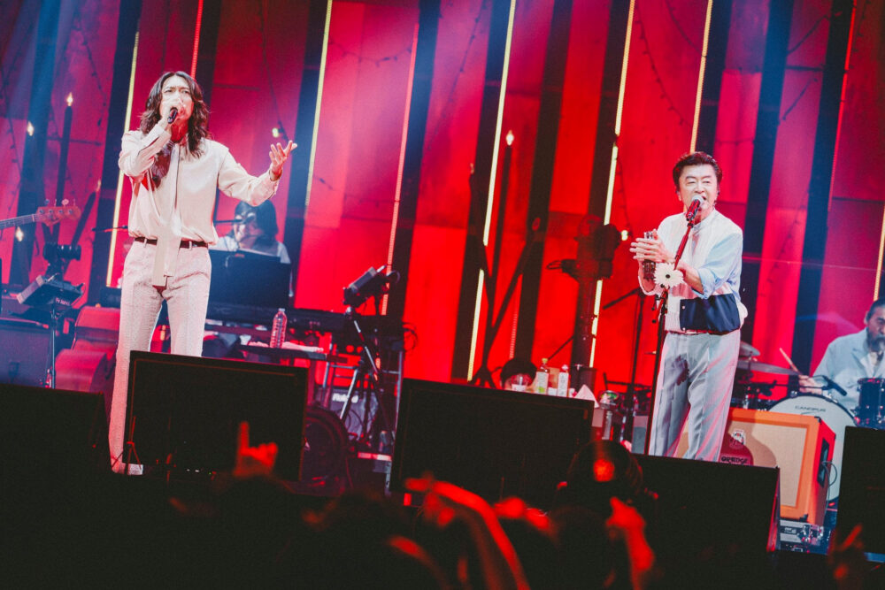拍手喝采で原 由子が舞台を後にすると、桑田佳祐が美輪明宏の「ヨイトマケの唄」を歌い始める。自身のライブで度々好んで歌唱する曲ですが、一部民放局では放送禁止楽曲とされていた時期も。労働者を歌うこの曲はまさに大衆歌。会場が感動に包まれ温かいムードになる中、一風変わってロックな演奏がスタート。THE YELLOW MONKEY「太陽が燃えている」。イントロに乗せて登場したのは、【吉井和哉】。まさか桑田率いるミュージシャンの演奏で、この曲が聴ける日が来るとは誰も想像していなかったでしょう。2024年のサザン最後の夏フェス出演「ROCK IN JAPAN FESTIVAL 2024 in HITACHINAKA」で、桑田と吉井は同日に出演。サザンの「勝手にシンドバッド」にサプライズ登場したのが初共演となり、1年越しの再会を果たした。吉井和哉のリクエストで、桑田佳祐のソロ曲「東京」を吉井が熱唱。桑田も“大好きな曲”と語る吉井和哉ソロ曲「みらいのうた」を逆リクエスト。日本のトップ・アーティスト同士がリスペクトを持って共演する舞台が実現。