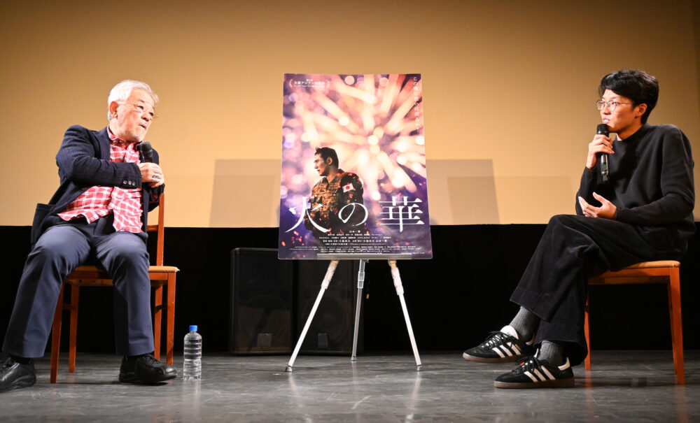 井筒監督は、本作が監督オリジナルの企画であり、独⽴プロによる製作であることにも触れ、「製作委員会のような企業の集合体がつくる、みんな責任逃れな映画が多い中で、『⽕の華』は思いの分かる連中だけでつくった、腹を括った映画ですよ」とその⼼意気にも⼼酔した様⼦。続けて「劇中には国に恨みを持つ隊⻑や、中国マフィアも出てきて……だいぶ“病んどる”映画ですよ、まるで『タクシードライバー』※やぞ、と。久しぶりに画⾯に⾷いついて観てました」と、とにかく井筒節が⽌まらない。