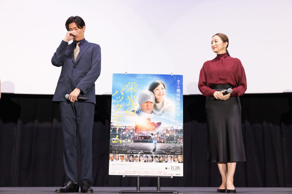 その一方、「彼はちょっとボケてるんです」と言い、「横田はいい身体してるんだから、ちょこちょこ当てにいくな。自分を松井秀喜だと思って振れ」と言い続けていて。「松井秀喜だぞ」って言うと、「はい!」って返事はめちゃくちゃいいんです。でも「おい、松井って知ってるか?」って聞くと「聞いたことはあります。なんとなくわかります」って(笑)。知らなかったのか、と(笑)。こっちが拍子抜けするぐらい可愛いというかお茶目というか。僕は何のために松井秀喜の名前を何回も出したんだろう?って(笑)。この映画の中では、彼の性格、生き方全てがそのまま映ってるので、楽しみに観ていただけたらと思います」と、横田選手のエピソードを明かし、場内は温かい笑い声に包まれた。