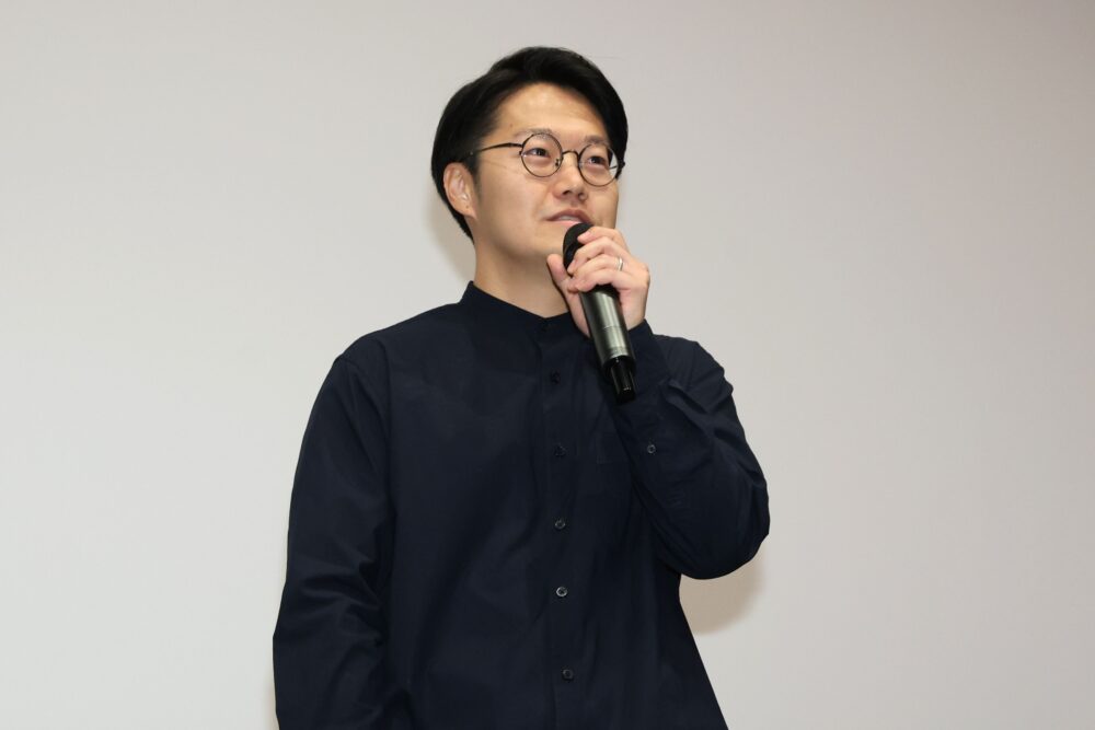 上映後の静かな余韻に包まれている会場に向けて、「なるべく皆さんのこの余韻と時間を邪魔しないように。短い時間ですがよろしくお願いします」とあいさつした⼤森監督。