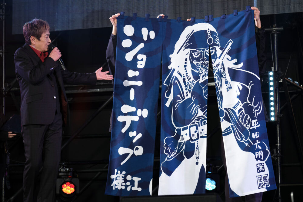 暖簾のプレゼントを手渡しながら、「私の知り合いで海賊の漫画をよく描いている男がいるのですが…」と、思わず会場がざわつくユーモアを交えて紹介。ファンからは歓声と笑いが起き、ふたりの長い歴史を感じさせる温かなやり取りが繰り広げられた。