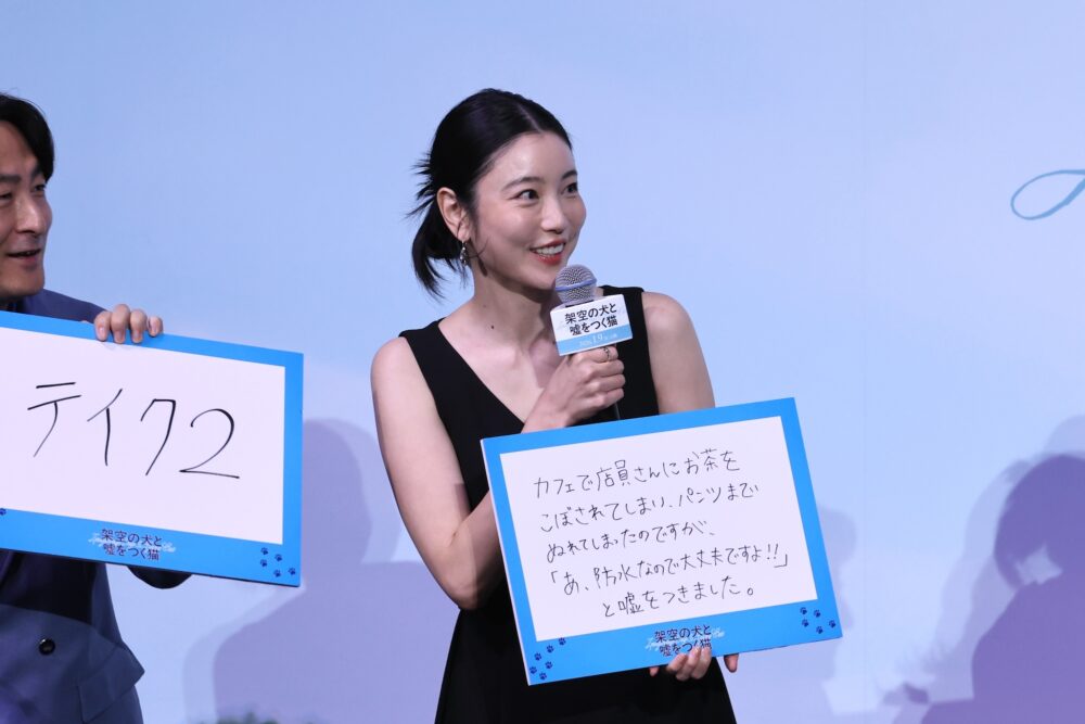 イベント後半では、映画にちなみ「皆さんがこれまでについた『優しいうそ』を教えてください」というトークコーナーが。まずは向⾥が「カフェで店員さんにお茶をこぼされて、びしょ濡れになったけど『防⽔なので⼤丈夫です』とうそをついた」というエピソードを披露。「そこで変な空気になると、店員さんがバイト時間中、引きずったままになってしまうかなと思って」という優しい配慮に、登壇者たちからは「優しい!」と感嘆の声が。