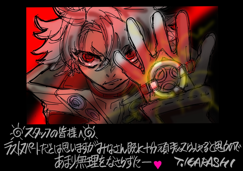 菅沼芙実彦(監督)からは、好きなお菓子を食べるルドと共に「あと少し‼がんばれ!がんばれ!」のメッセージ付き。五十嵐卓哉(アニメーター)からは、人器「3R(グローブ)」とルドを描き、「スタッフの皆さまへ ラストスパートだとは思いますが、みなさん既に十分頑張ってらっしゃると思うので、あまり無理をなさらずに―」とスタッフを気遣うメッセージを寄せた。山方春香(アニメーター)は、笑顔で振り向きショットのアモを描いている。