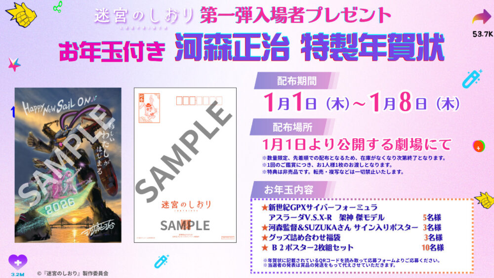 本作の監督を務めた河森正治監督が描き下ろした「お年⽟付き 河森正治 特製年賀状」が、公開初週となる1⽉1⽇〜1⽉8⽇までの期間、数量限定で配布されることが決定した。※なくなり次第終了となります